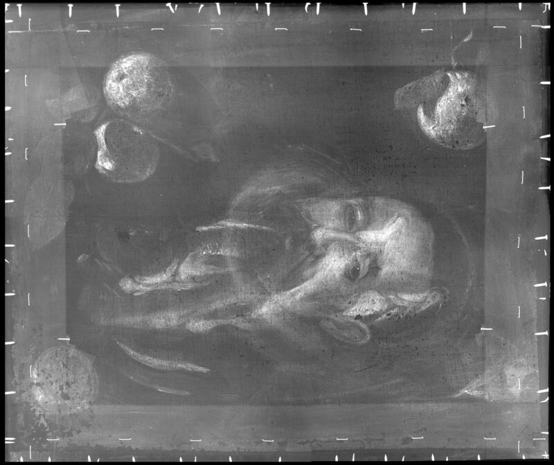 AutorAlejandro de LoarteTécnicaÓleo sobre lienzo El cuadro a simple vista. Imagen radiográfica de la obra, donde se aprecia que el bodegón está pintado sobre una composición anterior, en este caso un retrato.Alejandro de LoarteBodegón con pescados, cítricos y pimienta negra