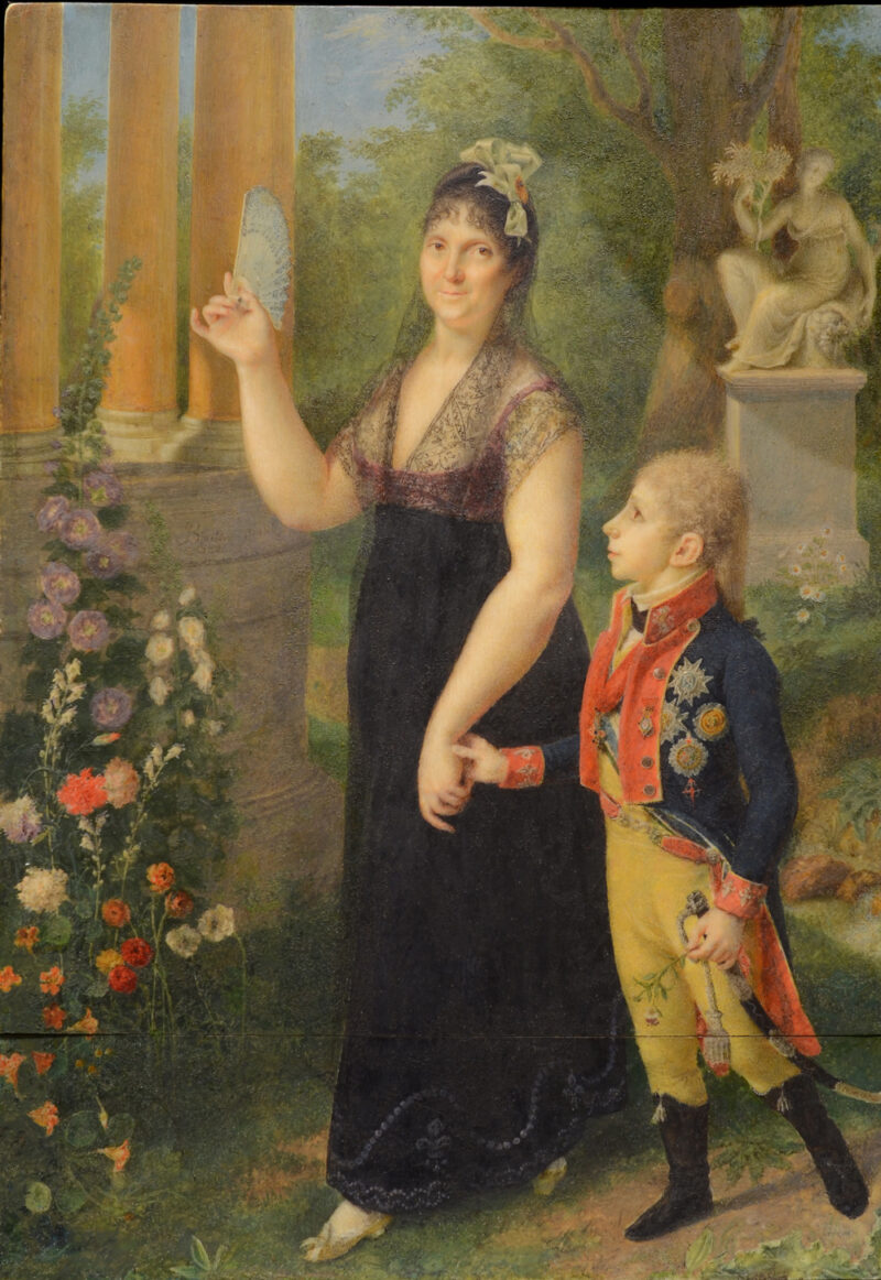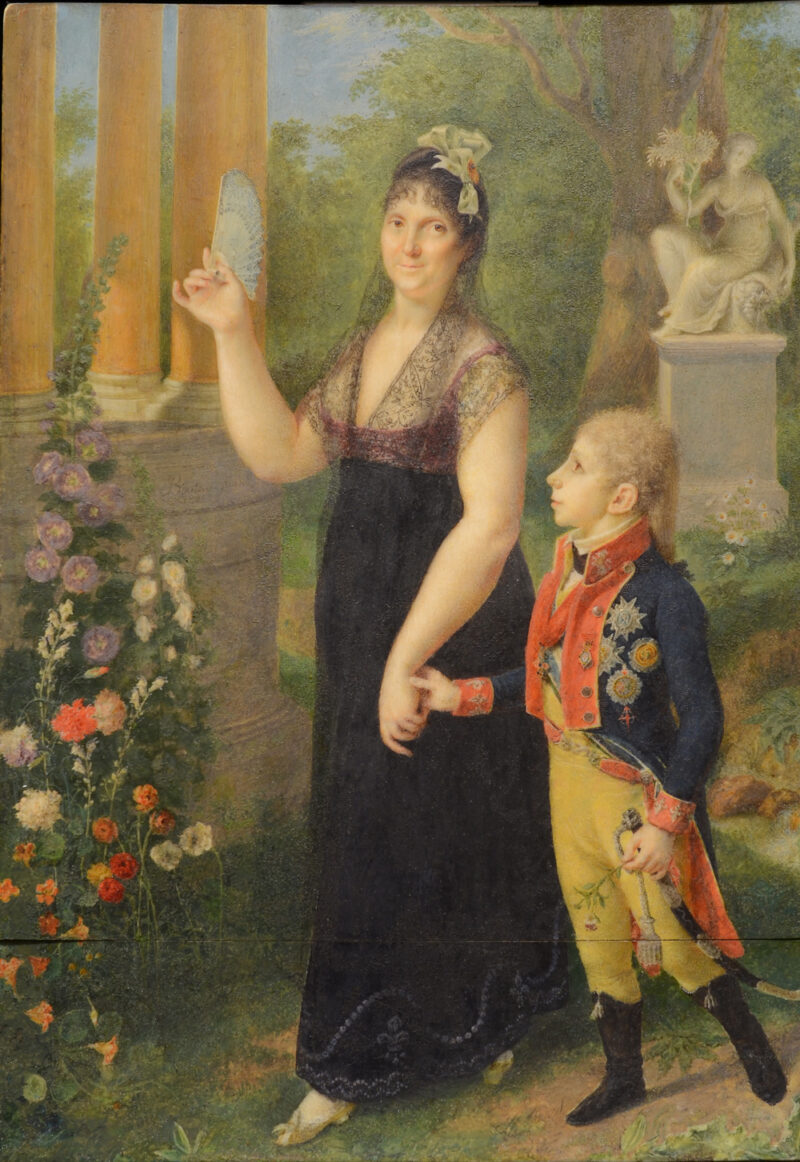 AutorJosé María BoutonTécnicaÓleo sobre cobre, marco original 1. La obra antes de la restauración, los colores aparecían apagados 2. Durante el proceso de limpieza, observen la diferencia en la esquina superior derecha 3. En su regio marco original de estilo neoclásico, con las iniciales de la reina en el copeteJosé María Bouton (Cádiz, 1768 – Chentes, Francia, 1823)Retrato de la Reina de España, María Luisa de Borbón-Parma y de su hijo, el Infante Francisco de Paula, en los jardines de Aranjuez, 1805Aguada de pigmentos opacos sobre marfil 22,50 x 15 cm
