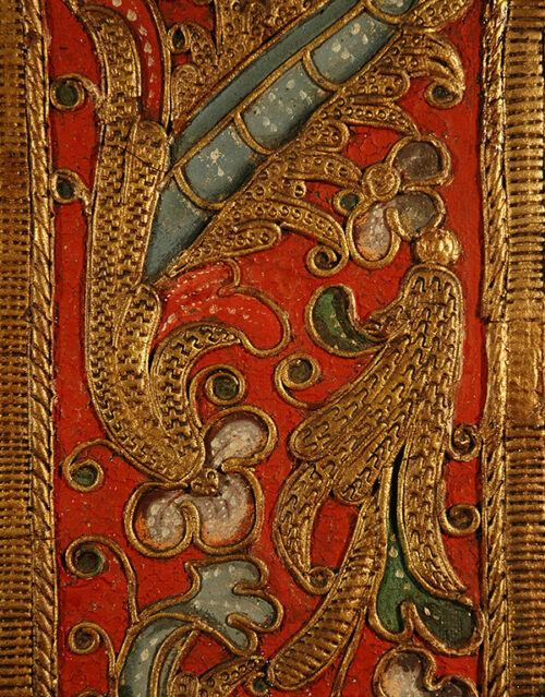 Detalle del marco fingido tras la restauración donde se han recuperado la intensidad de los colores y el brillo de la decoración dorada
