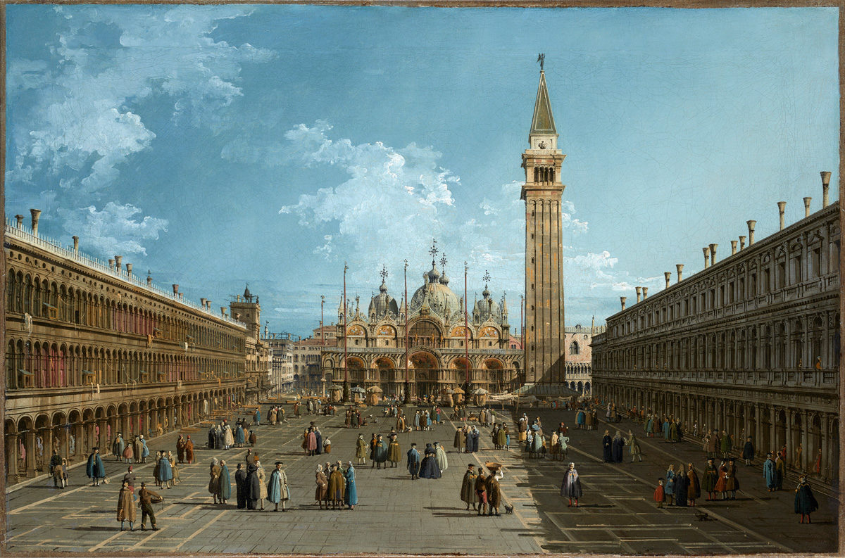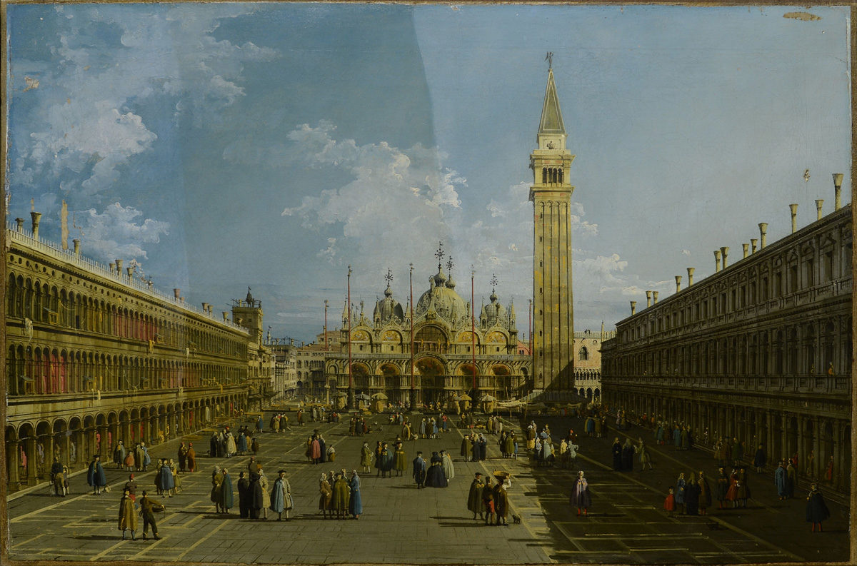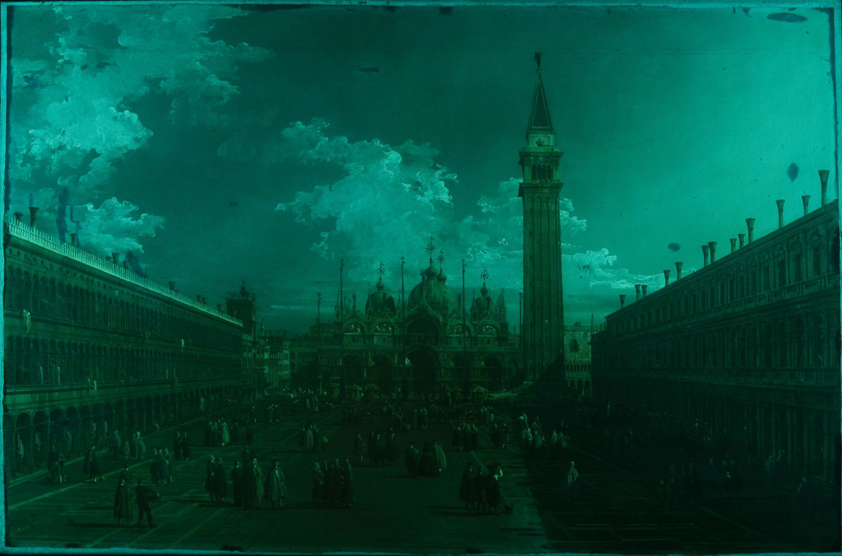 AutorBernardo BellotoTécnicaÓleo sobre lienzo La obra antes de su intervención Durante la limpieza se puede apreciar el color amarillento del barniz Fotografía final tras la restauración Fotografía con luz ultravioletaBernardo BellottoVenecia, Plaza de San Marcos mirando al Este hacia la Basílica, ca. 1737